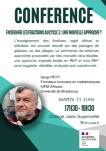 En octobre, pendant les journées nationales de l’APMEP de Rennes, nous avons assisté à un atelier sur l’enseignement des fractions au cycle 3 par Monsieur Serge Petit. Sortis enthousiasmé, nous avons entrepris de faire venir Serge Petit à Bressuire. Avec le support du labo, le soutien de l’inspection, de nombreuses réunions préparatoires et l’accord de Serge Petit, cela fut possible. Mardi 11 Juin, Serge Petit présentait ses travaux pendant une conférence devant une trentaine de personnes (professeurs école et collège, inspecteurs, conseillers pédagogiques). Cette conférence fut suivie le lendemain par un atelier de mise en pratique avec des collègues volontaires.
